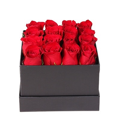 Siyah kare kutu içerisinde 16 adet kırmızı gül aranjmanı.