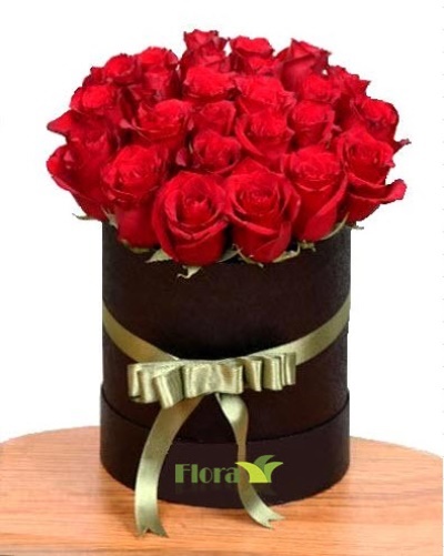 Siyah yuvarlak kutu içerisinde 25 Adet kırmızı gülden aranjman.