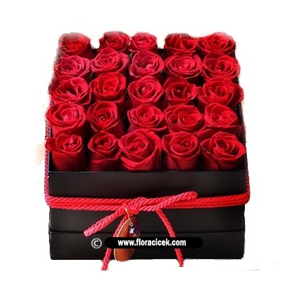 Siyah kare kutuda 25 adet kırmızı güllerle hazırlanan aranjman.
