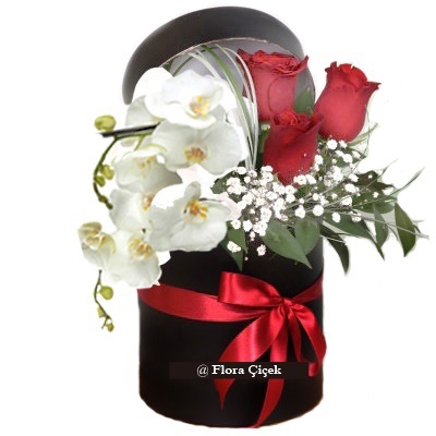 Siyah yuvarlak kutu içerisinde orkide ve gülden aranjman.