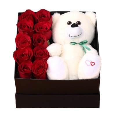 Siyah kare kutu içerisinde peluş ayıcık ve kırmızı güller.