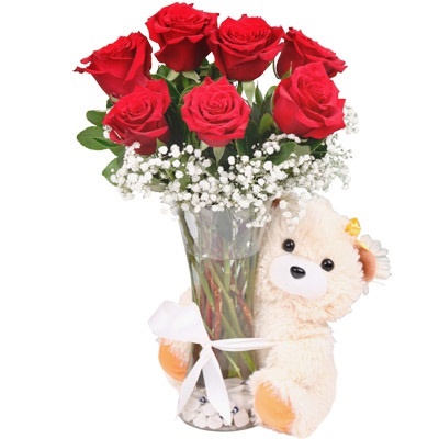 Vazoda 7 adet kırmızı gül ve 20 cm peluş ayıcık.