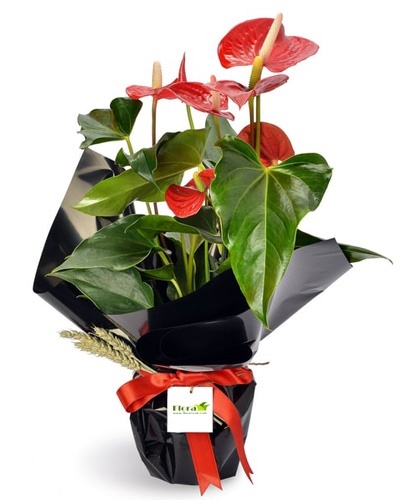 60 cm boyunda kormızı çiçekli antoryum bitkisi.