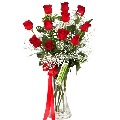 Cam vazoda 11 adet kırmızı gül aranjmanı.