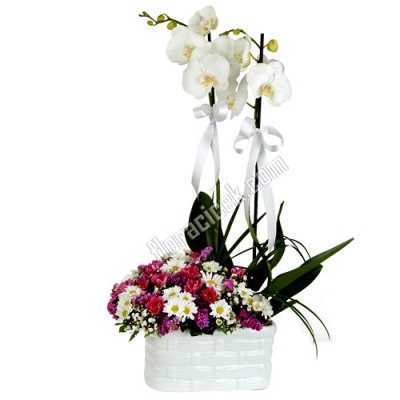Geniş beyaz seramik içerisinde 2 li beyaz palonepsies köklü orkide ve kır çiçekleri ile aranjman.