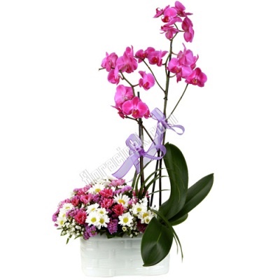 Geniş beyaz seramik içerisinde 2 li pembe palonepsies köklü orkide ve kır çiçekleri ile aranjman.