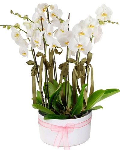 Yuvarlak geniş seramik saksıda 8 dal beyaz orkide aranjmanı.