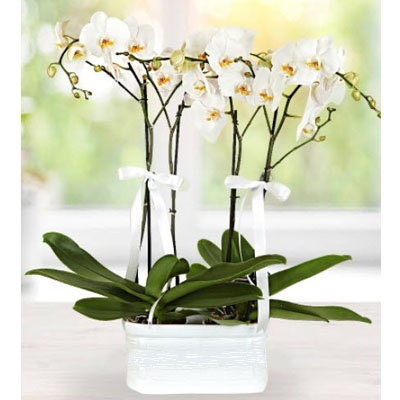 Geniş beyaz seramik içerisinde 4 dallı beyaz palonepsies köklü orkide.