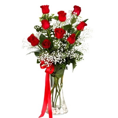 Cam vazoda 9 adet kırmızı gül aranjmanı.
