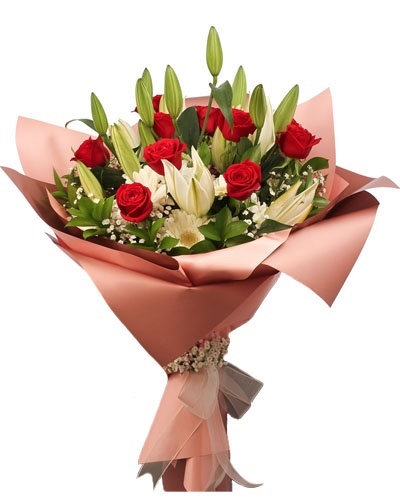 7 Adet kırmızı gül, 3 dal lilyum ve yeşilliklerden hazırlanan buket.