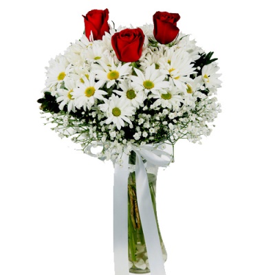 3 adet kırmızı gül ve papatyalardan hazırlanan aranjman.