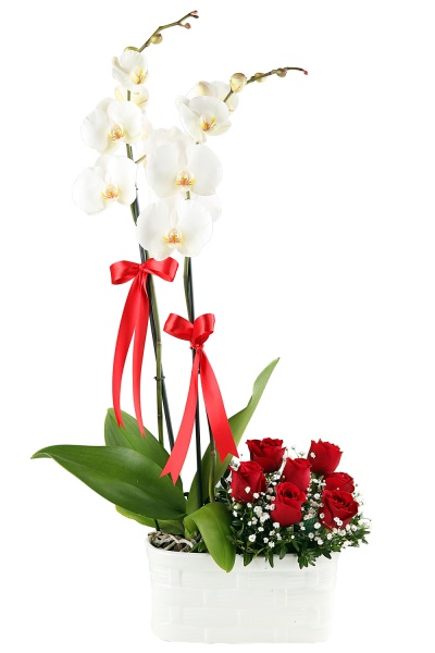 Geniş seramik içinde 2 dallı beyaz orkide ve 7 adet kırmızı gül aranjmanı.