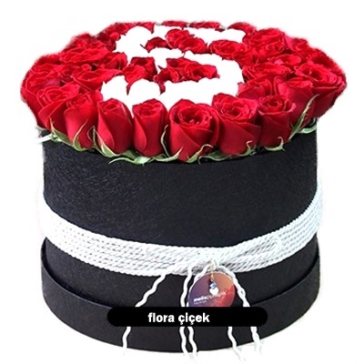 Yuvarlak silindir kutuda istenilen harf beyaz güller ve kırmızı güller ile hazırlanan tasarım.