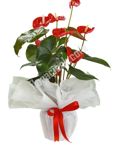 50 cm boyunda kırmızı yapraklı antoryum bitkisi.