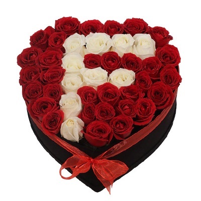 Siyah kalp kutuda güllerle hazırlanan harf aranjmanı. (35-40 adet gül kullanılmaktadır)