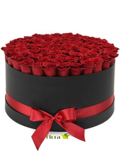 Siyah yuvarlak kutu içerisinde 101 Adet kırmızı gülden aranjman.