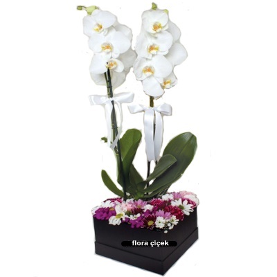 Kare siyah kutu içerisinde 2 li beyaz orkide - palonepsies köklü bitki ve kır çiçekleri aranjmanı.