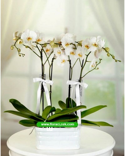 Geniş seramik saksıda 4 dal beyaz orkide aranjmanı.