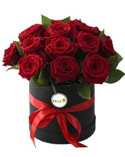 Siyah yuvarlak kutu içerisinde 20 adet kırmızı gülden aranjman.