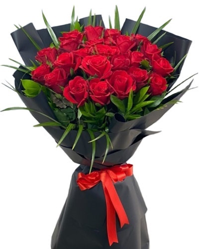 21 adet kırmızı gül ve değişik yeşilliklerle hazırlanan buket.