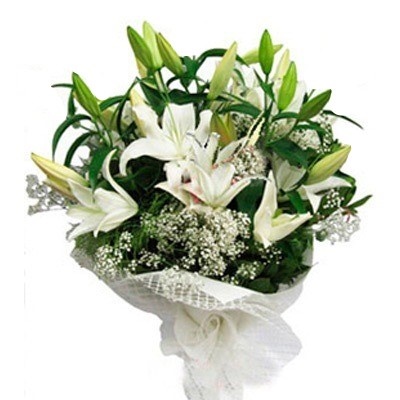 5 Dal çok çiçekli beyaz renk lilyumlardan buket.