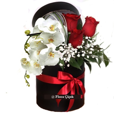 Siyah yuvarlak kutu içerisinde orkide ve gülden aranjman.